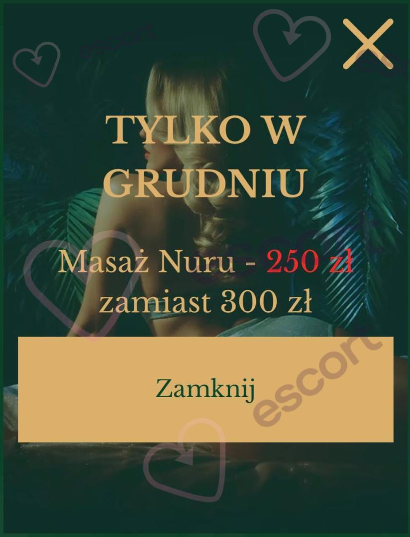 Masaż Nuru (250 zł/h, 200 zł/30min) - to masaż całego ciała wykonywany przy użyciu specjalnego olejku, lub żelu który sprawia, że doznania są wyjątkowo intensywne i relaksujące. Sesja odbywa się na macie, a Masażystka, używając swojego nagiego ciała – brzucha, piersi oraz pupy – masuje Twoje nagie ciało, pobudzając zmysły i wprowadzając w stan głębokiego erotycznego odprężenia. Masaż obejmuje również masaż lingam. Na miejscu można wybrać dowolne dodatki, aby jeszcze bardziej urozmaicić masaż i dopasować go do własnych oczekiwań.